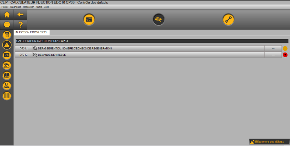 Et j'ai toujours le code défaut DF312 (demande de roulage) à l'état rouge et affiché au tableau de bord en plus du code DF311 passé de l'état rouge à orange clignotant : Je me serai attendu à ne plus avoir aucuns codes d'erreur.