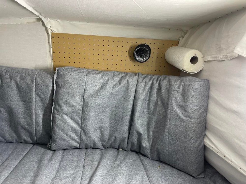 L'accès derrière le siège passager sert à laisser rentrer l'air chaud du chauffage de la voiture pendant le roulage, à faire passer les caisses et la glacière à l'avant au moment de déplier le lit après l'avoir retourné, mais aussi à isoler la partir couchage de l'avant pour la nuit, et donc réduire le volume à chauffer.