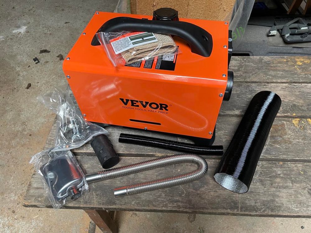 Puis je me suis attaqué au chauffage auxiliaire. Webasto et Eberspächer étant hors de mon budget, c'est Vevor qui a eu ma préférence. Le modèle est trop puissant, 5kW, mais les plus petits de 2kW n'existent qu'en kit, et j'ai déjà assez à m'occuper pour ne pas en plus faire un puzzle chinois pour lequel j'ai compris qu'il faut remplacer certaines pièces neuves avant montage pour cause de mauvaise qualité.