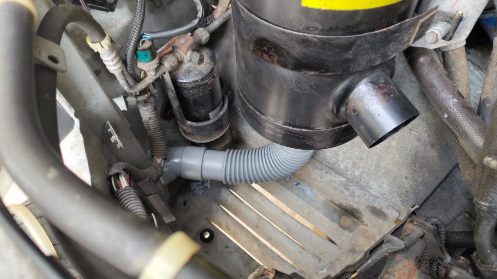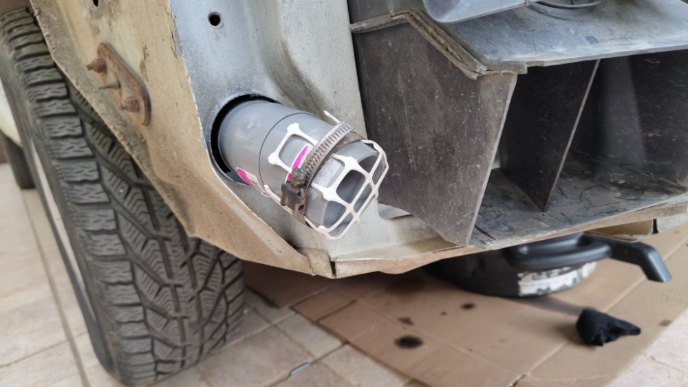 J’ai acheté un raccord souple en 50 mm, quelques coudes du même diamètre et j’ai assemblé le tout à la colle néoprène. J’ai ajouté une petite grille à l’avant pour protéger l’entrée, histoire de faire les choses bien.