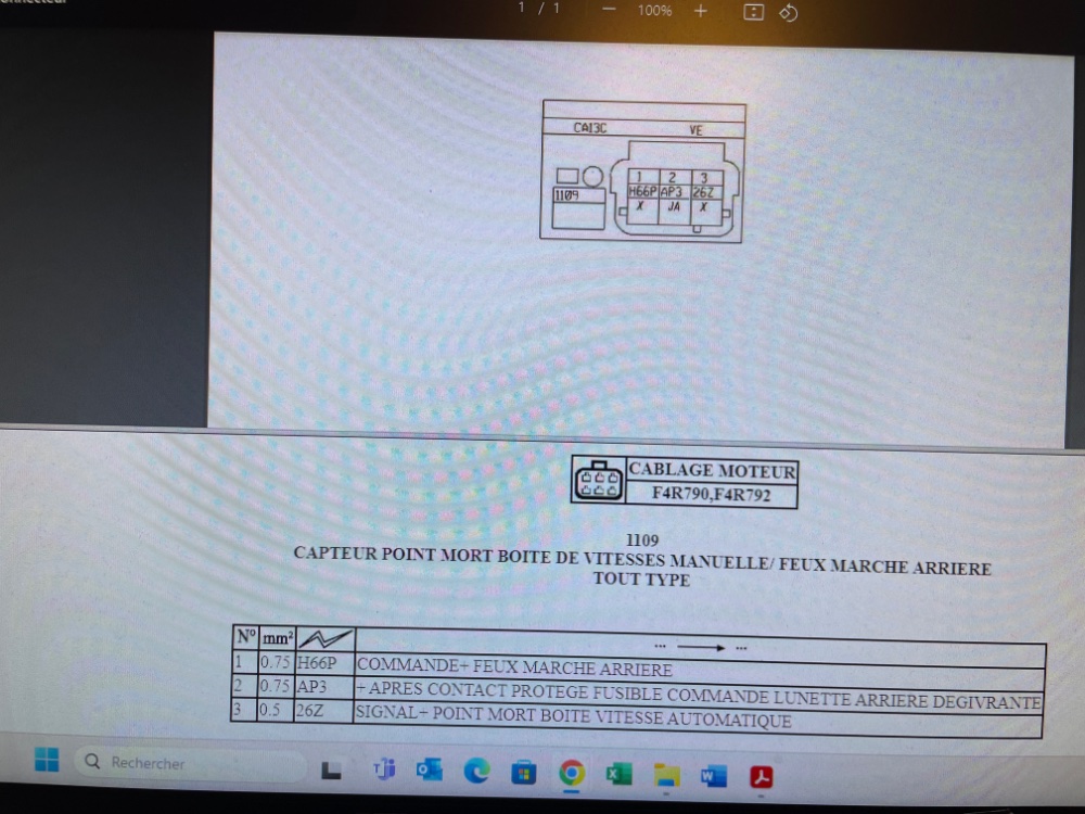 Tu as un fil alimentation, un marché arrière et le troisième le point mort qui deconne. Mais où je sais pasLeJeune6troeniste a écrit : 28 sept. 2024, 00:13 C'est possible, ça fait un bon moment que je ne l'ai pas vu. Mais deux fils ne suffiraient-ils pas ? Un pour la marche arrière, un pour le point mort, pas de signal pour un rapport marche avant, avec une masse commune au travers de la boîte ?