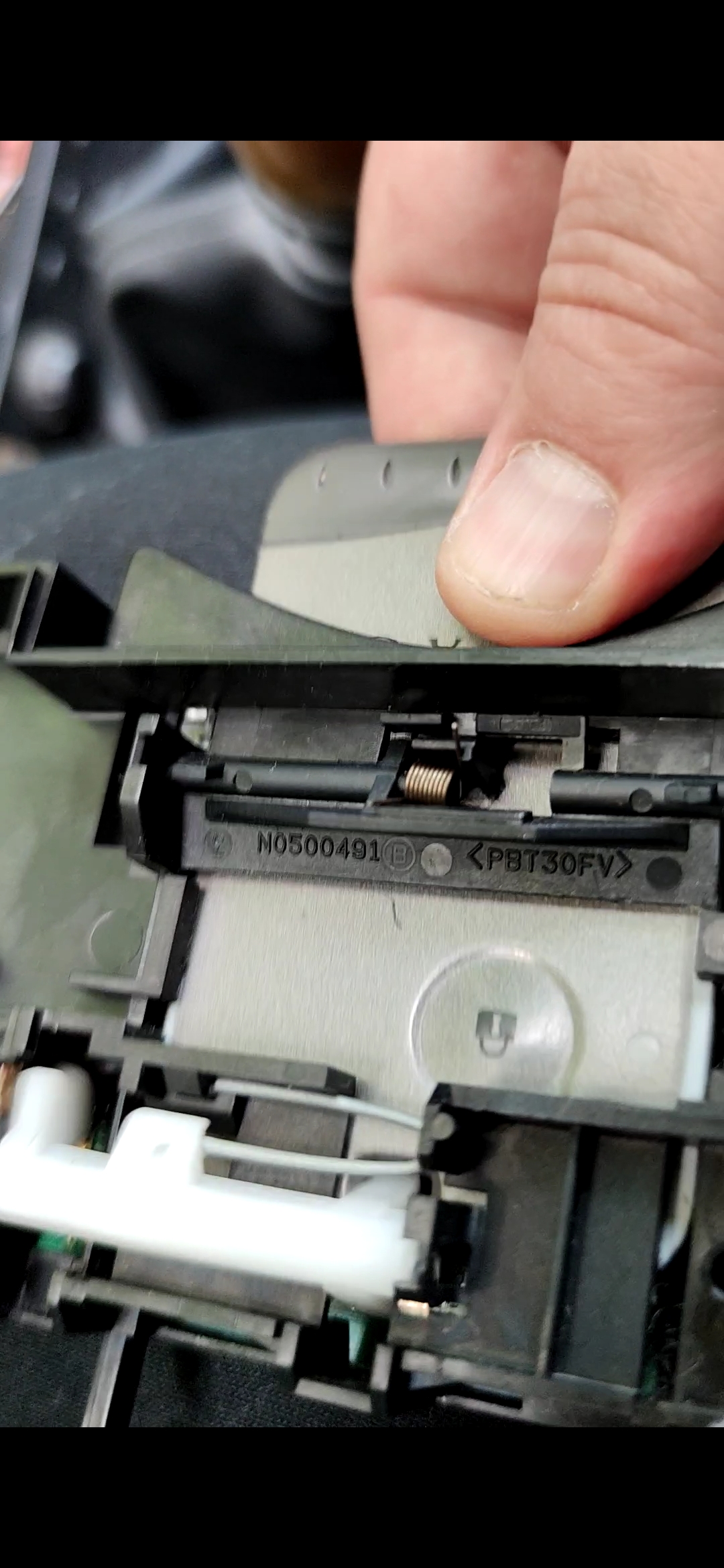 Dans mon cas, la pièce en plastique blanc était déjà en position verrouillée. Ce qui fait que la carte devait tant bien que mal se faufiler entre la pièce en plastique blanc et le switch de détection de la carte afin d'être détectée...