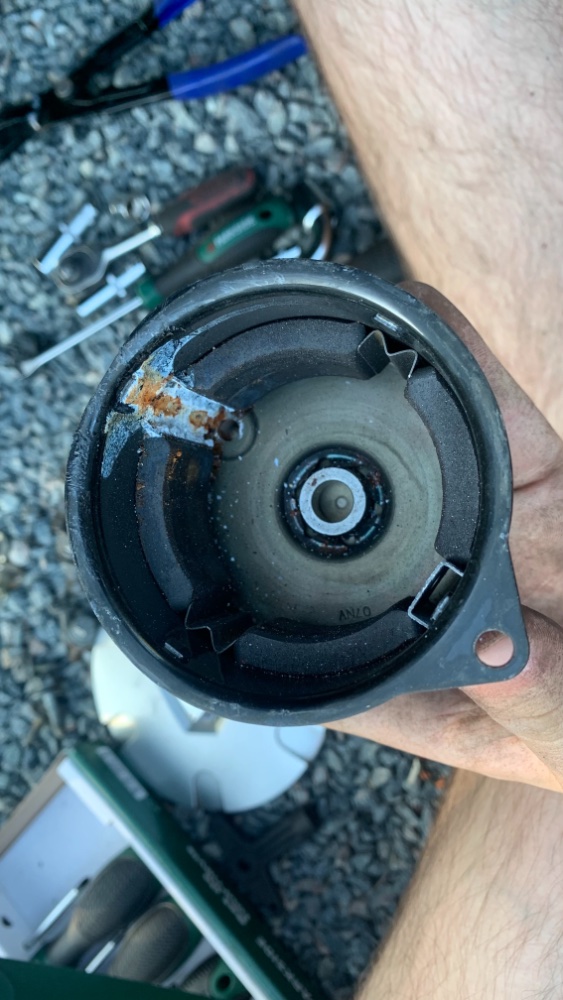 Du coup j'ai démonté le moteur de bloc ABS, effectivement comme tous ceux qui sont passés par là on s'aperçoit que l'humidité s'infiltre par la vis du bas, dans mon cas le carter était sec mais corrodé en partie basse.