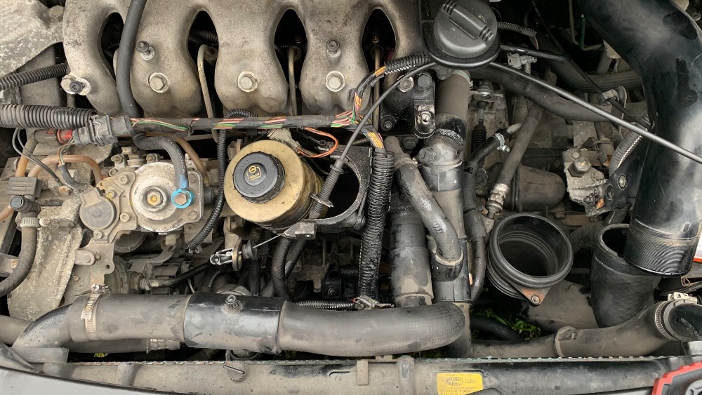 Il m'a fallu sortir la boite à air avec son support métallique et le débitmètre, les durites de suralimentation, la jauge à huile avec son support et le renfort métallique entre la pompe de DA et le bloc.