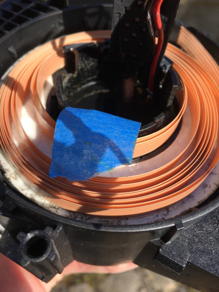 Je reviens à l'attaque après un coup de... malade, tout bête. C'est sorti de la voiture et c'est dépiauté : ouvert on voit bien la bande qui s'enroule. En revanche je ne vois pas comment sortir la platine sans arracher : je mets une photo demain après partiel.