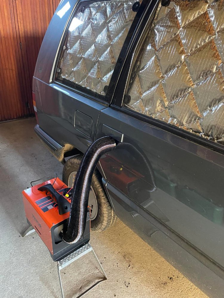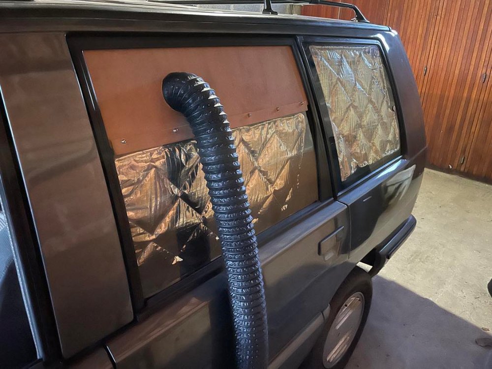 L'arrivée d'air sera par la porte gauche, car elle ne servira qu'à ce moment là. Sinon, ce serait compliqué de sortir par la porte arrière droite avec le tuyau d'air chaud qui passe à travers. J'ai donc baissé la vitre et ai remplacé la partie manquante par une plaque d'isorel qui vient l'enfourcher. J'ai choisi aussi d'utiliser la porte arrière, car les montées et descente de vitre sont manuelles. Donc, pas de risque de coincement, de chauffe du moteur, etc si j'avais utilisé une des portes avant.