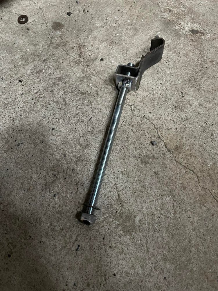 Mais cela ne suffit pas. Maintenant que ça passe, la tige filetée est trop courte pour accrocher le panier. Qu'à cela ne tienne, je vire la goupille fendue, la grande vis, l'écrou flottant et je remplace le tout par une tige filetée en M12, avec un écrou soudé au bout pour faire tête de vis, en 19 comme avant, et un autre écrou soudé sur la partie mobile que j'ai conservé.