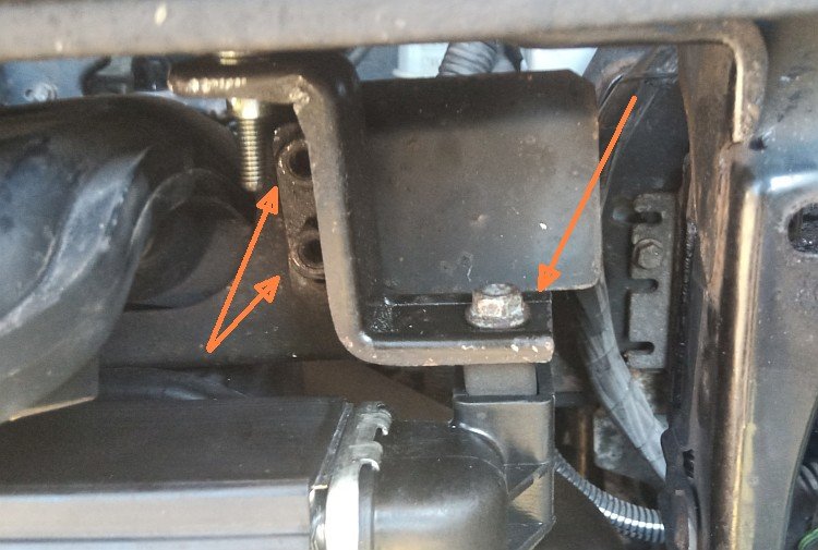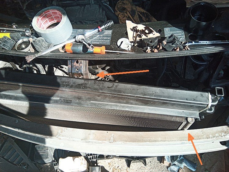 - défaire les deux vis de fixation du radiateur au niveau des silent blocs supérieurs