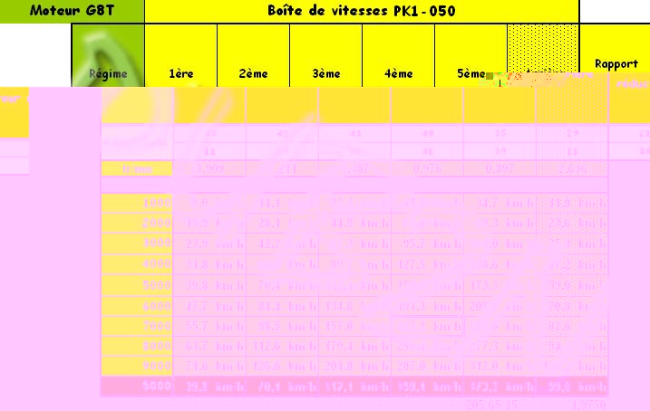 Salut, mon bébé atteint le 90 à 2250tr/Min, 105 à 2500 et 120 à 2750. Moteur g8t, bv pk1-050 et pneus 205/65r15. Et je confirme, pas de ronflement gênant, mais qu'est-qu'il tête.