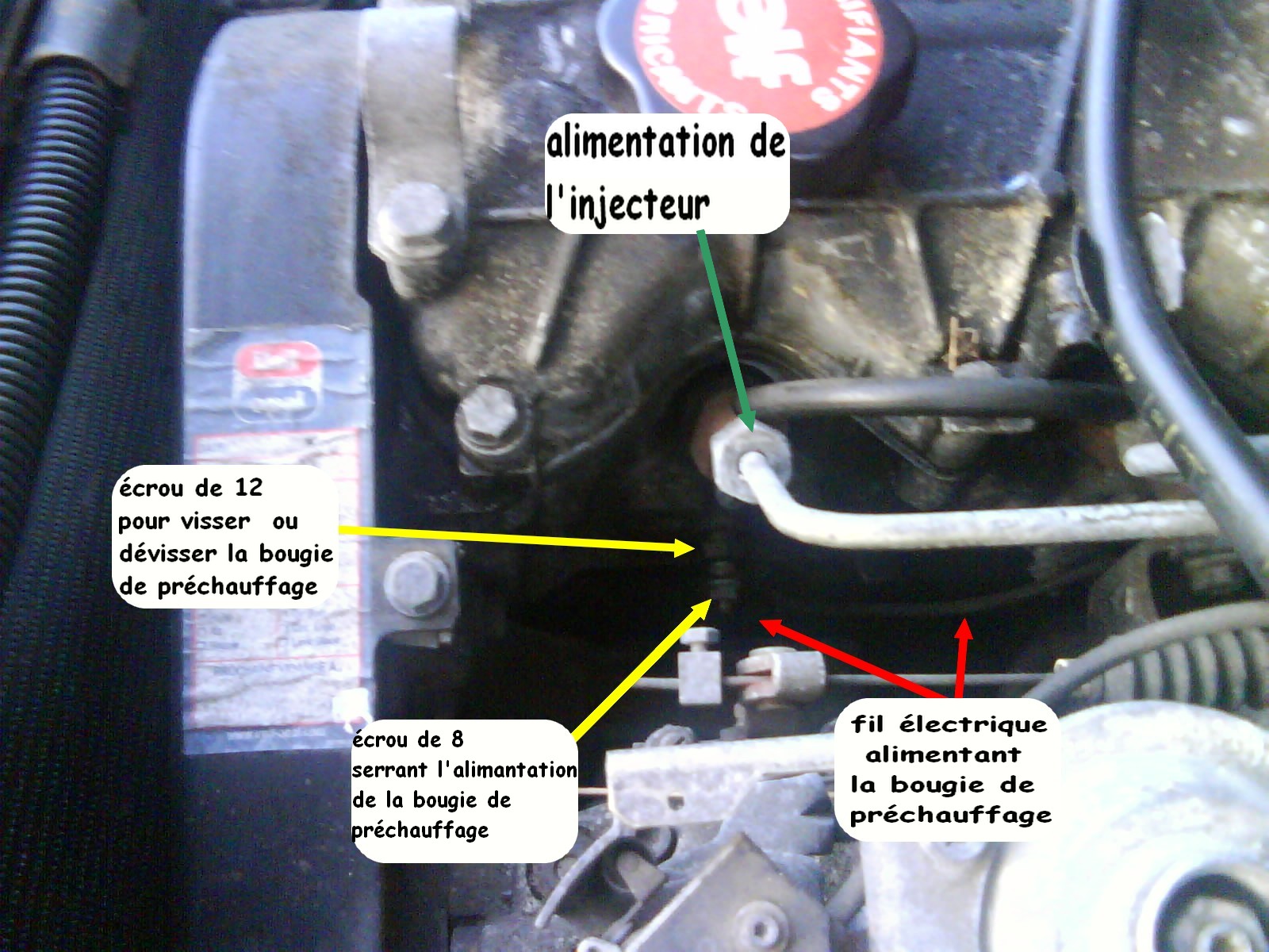 Alors pour tester la bougie de préchauffage correspondant au cylindre 4, il suffit de dévisser le petit écrou de 8,( avant de dévisser ce petit écrou , on aura pris soin de mettre un chiffon entre la pompe à injection et le bloc moteur pour ne pas les perdre (' merci dom 89)); de débrancher le fil électrique qui y arrive , puis de pendre le fil avec une pince