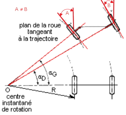 le braquage avec un angle important implique une différence d’angle entre les deux roues AV. Il faudrait un rayon de braquage variable entre les deux roues pour compenser ce rayon. Ce qui n’est pas le cas avec nos crémaillères (euh comme ça je n’en connais pas). Donc possible ripage de la roue intérieure lorsque l’on fait un braquage à fond Même avec un bon réglage de train.