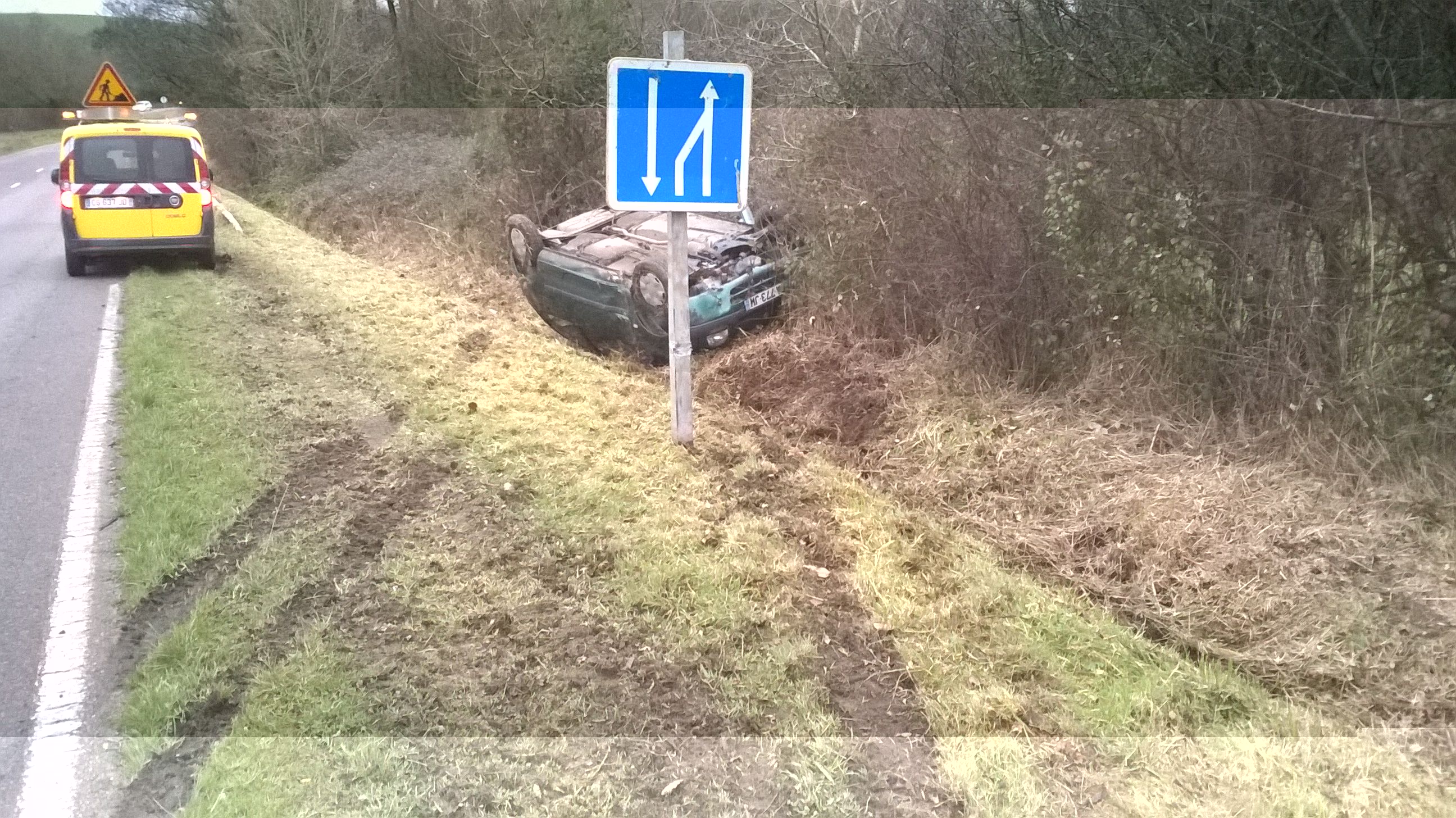 En fait le panneau a été couché avec son socle de béton par la voiture et la DDE (voiture jaune) qui passait par là au même moment l'a tout simplement relevé.