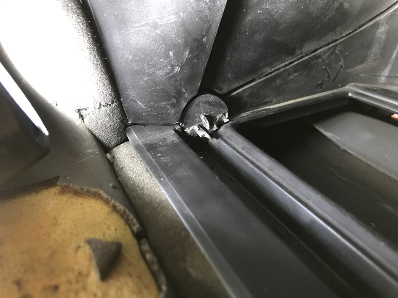 Une fois tout cela observé, il m'a fallu sortir le volet. Impossible même en le tordant dans tous les sens, vu qu'il est pris aussi côté droit (même si l'articulation est libre). Je l'ai donc découpé au milieu avec un Dremel: