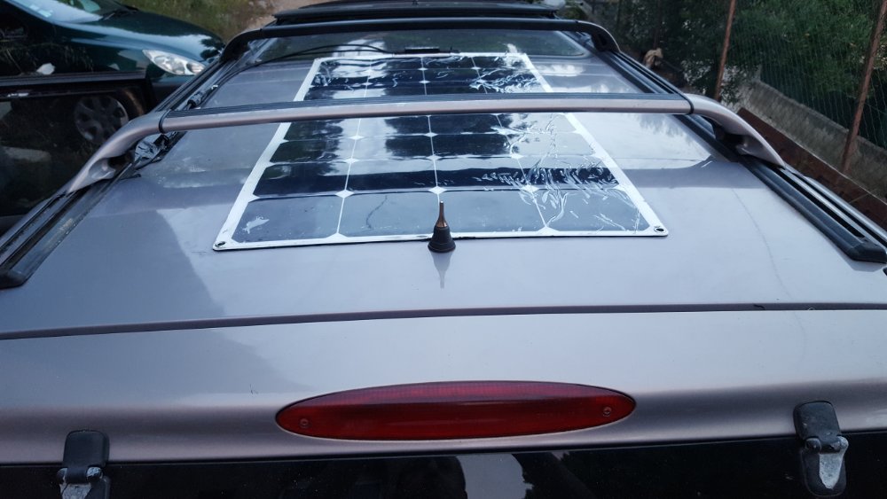 Au cas ou certains seraient tenté par l'utilisation d'un panneau solaire voici ma petite expérience. Je n'ai fait aucun trou sur la carrosserie histoire de ne pas risquer l'inondation et que le montage puisse être retiré si besoin.