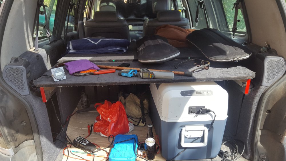 Je transforme un petit-peu mon Espace III pour pouvoir l'utiliser en mini camping car. Rien de bien original ni perfectionné, juste de quoi pouvoir dormir n'importe ou ou être plus confortable que sous la tente dans un camping.