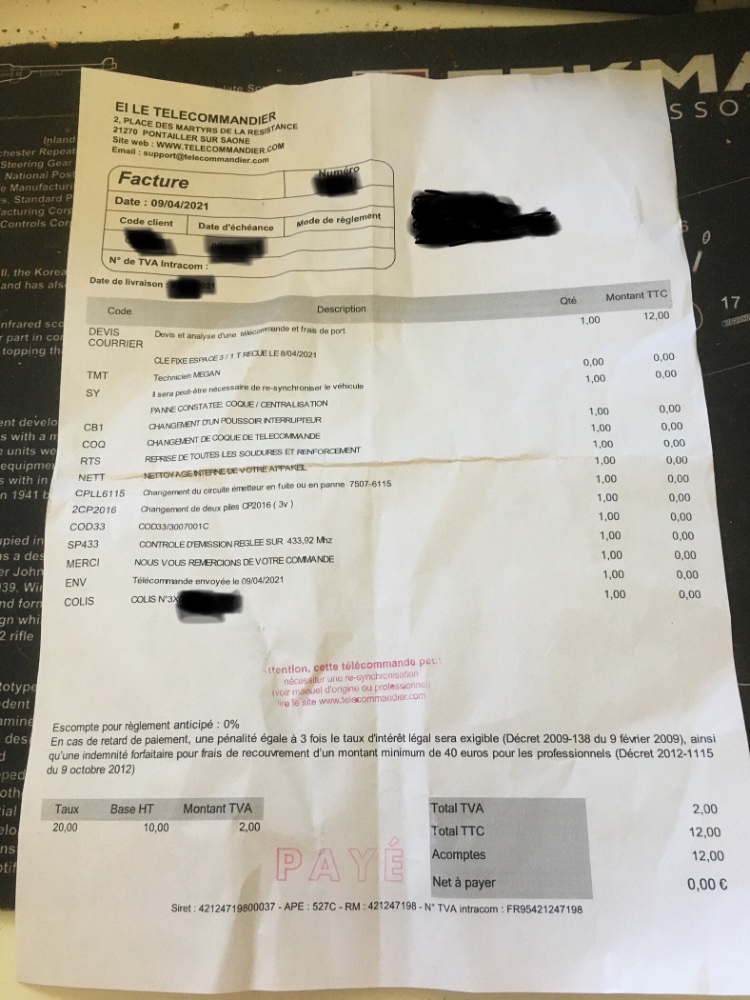 Oui c’est aussi ce que je me suis dit mais bon, ce n’est pas moi qui est établi la facture, ils ne m’ont pas contacté après avoir reçu ma clef alors que je pensais recevoir un devis de réparation en plus des 12€ de diagnostic. J’ai payé les 12€ par CB sur leur site et la facture mentionne bien 12€ comme total alors...