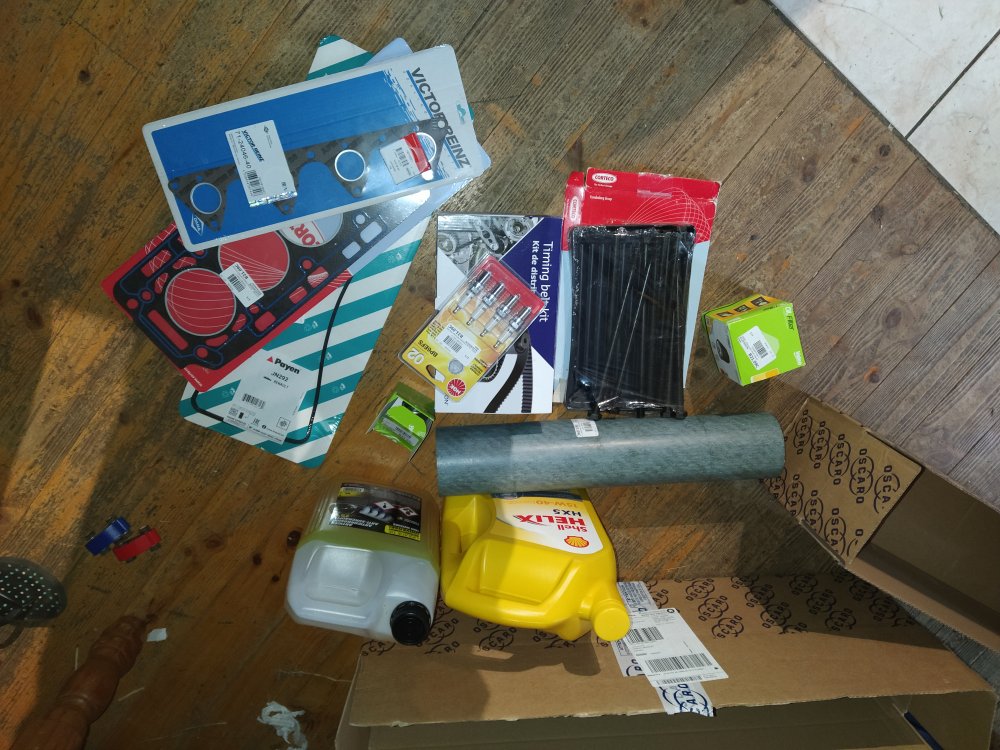Joint ce culasse, joint de couvre culasse, joint de collecteur d'échappement, visses de culasse, joints de queue de soupapes, feuille de joint à découper pour les autres joints, LDR, huile, filtre à huile, calorstat, kit de distribution.