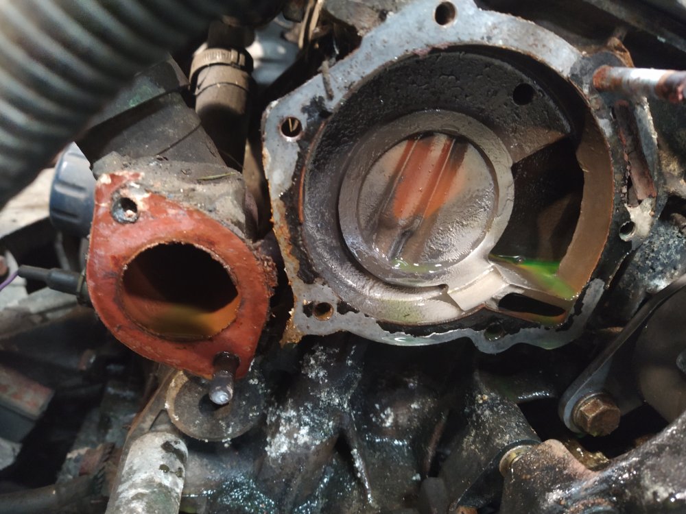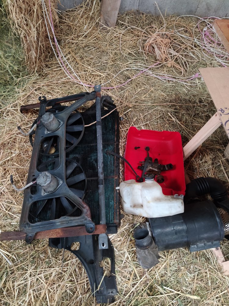 Ensuite j'ai vidangé le circuit de refroidissement et retiré les ventilateurs ainsi que le radiateur. Il semble encore bon, même si les ailettes tombent facillement... il sera remplacé une fois que le moteur sera réparé (pour le cas où je n'y arrive pas).