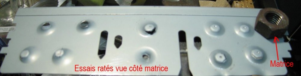À ce sujet j'ai appris deux ou trois "choses" sur la manière d'emboutir de la tôle, il y a un rapport entre la tôle (épaisseur) et les dimensions du poinçon et de la matrice. Un des éléments importants est le centrage poinçon/matrice. J'ai tenté le ruban adhésif sans succès, un trou de 4mm pour maintenir le poinçon, mais alors, c'était la matrice qui était décentrée. Finalement, ce qui a le mieux fonctionné, c'est un coup de pointeau qui vu la finesse de la tôle se voit des deux côtés, et un coup de colle en aérosol sur les écrous poinçon/matrice, ce qui m'a permis de les positionner correctement sur la tôle (centrés sur la marque du pointeau) et de placer le tout entre les mors de l'étau sans que cela bouge.