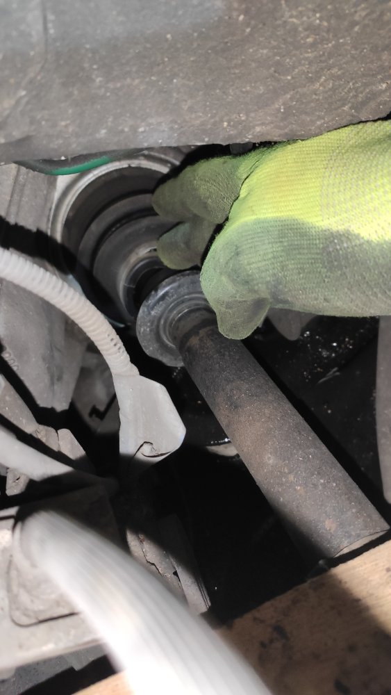 Il est encore en place, j'arrive à le sentir du bout des doigts... (Cela ne m'épargnera pas la vidange, mais pour le moins le coût d'achat d'un nouveau cardan)