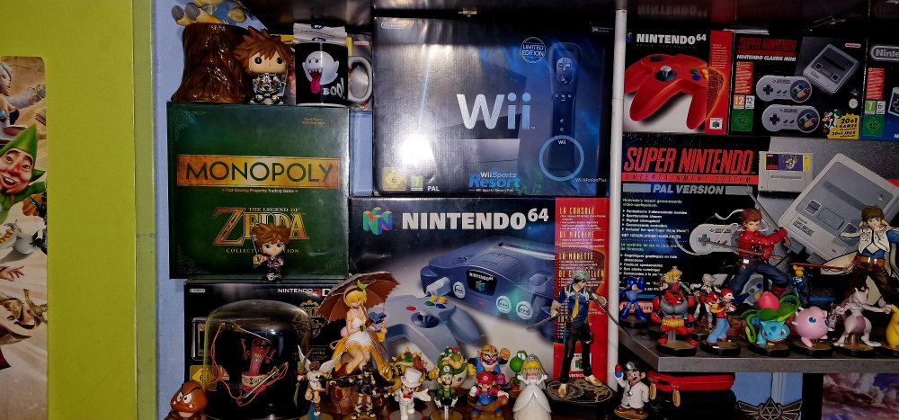 Pour la collection de consoles, c'est plutôt du côté de mon frangin qu il faut voir : n64 en boites de toutes les versions translucides, gamecube, packs super nes, les ps2 de toutes les,couleurs, megadrive, atari 2600, et des,centaines de jaux qui vont avec... Moi j'ai juste conservé une nes, une super nes, une megadrive et une n64 pour jouer de temps en temps...