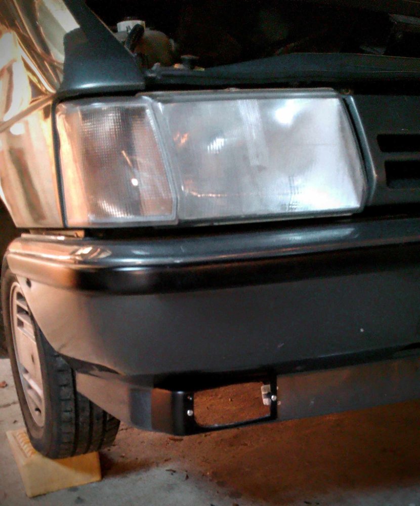 On part donc de là : J'ai bien l'impression qu'il me manque quelque chose surtout quand je vois la longueur de vis dont je vais avoir besoin... Comme les vis que j'ai sont trop courtes, je soude trois écrous et il me faudra juste visser des deux côtés du support de phare. C'est pas mal, il m'a fallu adapter le support au bouclier, mais ça va. Un truc "intelligent" : il semblerait qu'il faille démonter le phare anti-brouillard et son support pour changer les ampoules...
